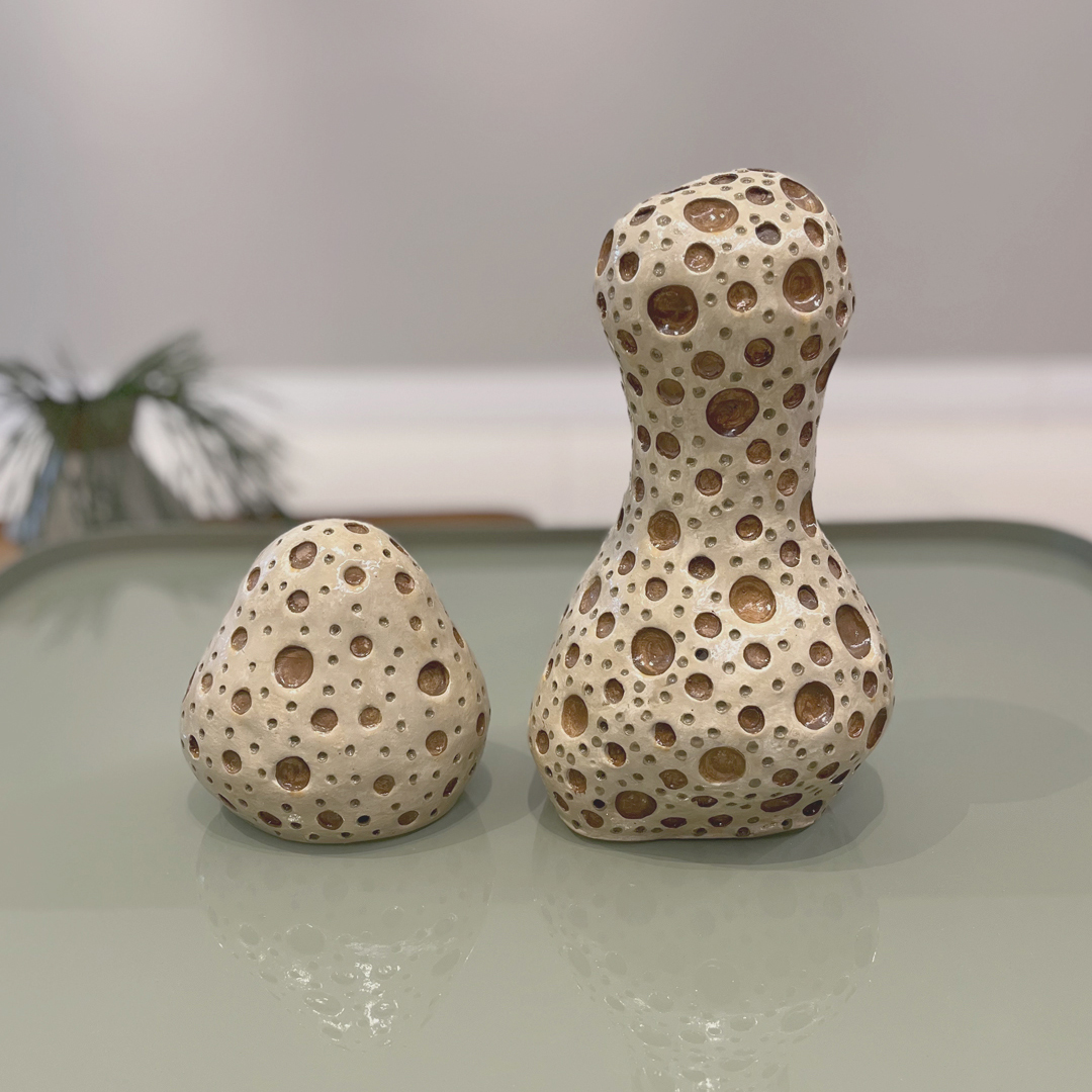 Escultura orgânica em cerâmica artesanal, modelada e pintada à mão.