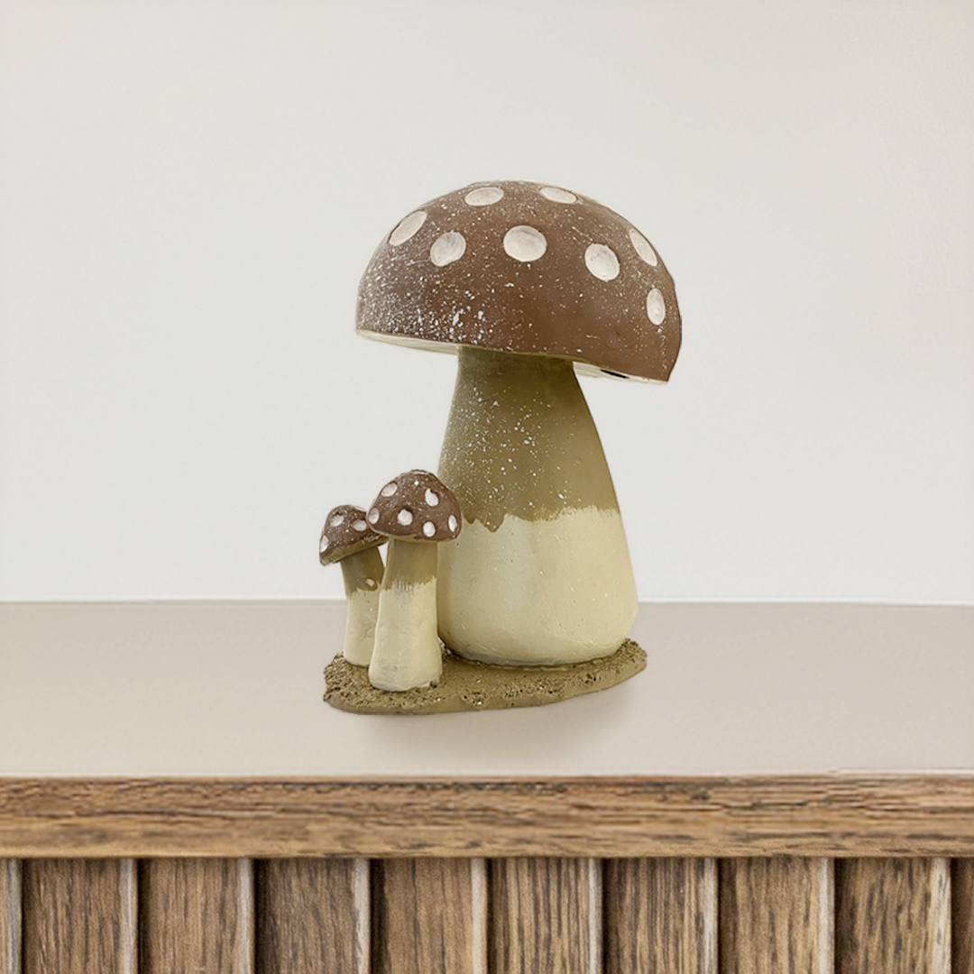 Cogumelo em cerâmica decorativa, com estilo rústico.