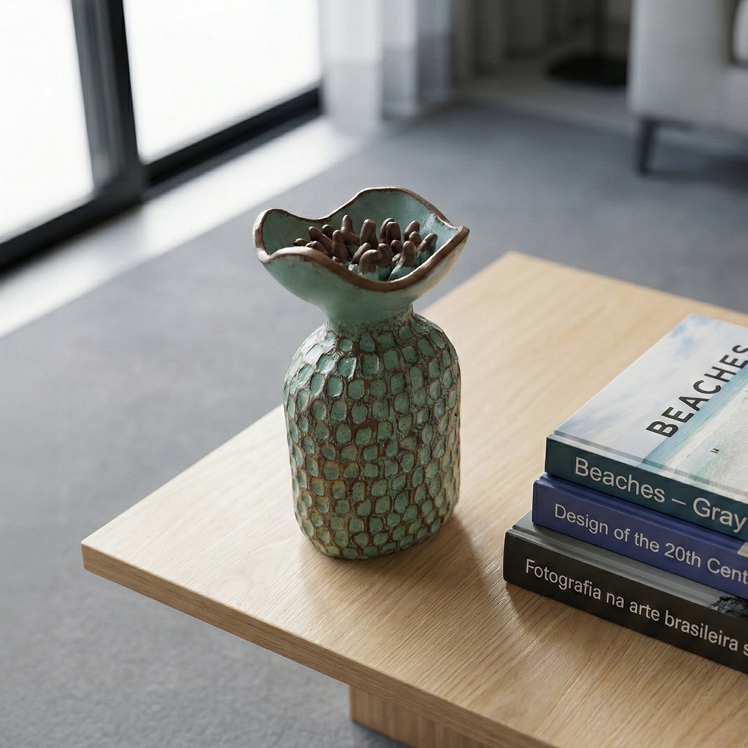 Com textura orgânica e abertura superior que lembra corais e movimentos do fundo do mar, carrega uma estética abstrata que dialoga com a natureza sem precisar imitá-la.