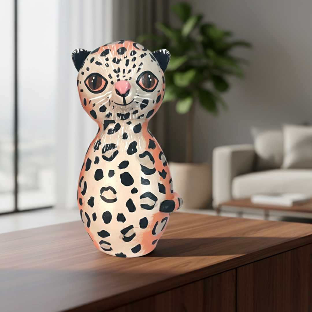 Escultura decorativa em cerâmica artesanal, com estilo lúdico.