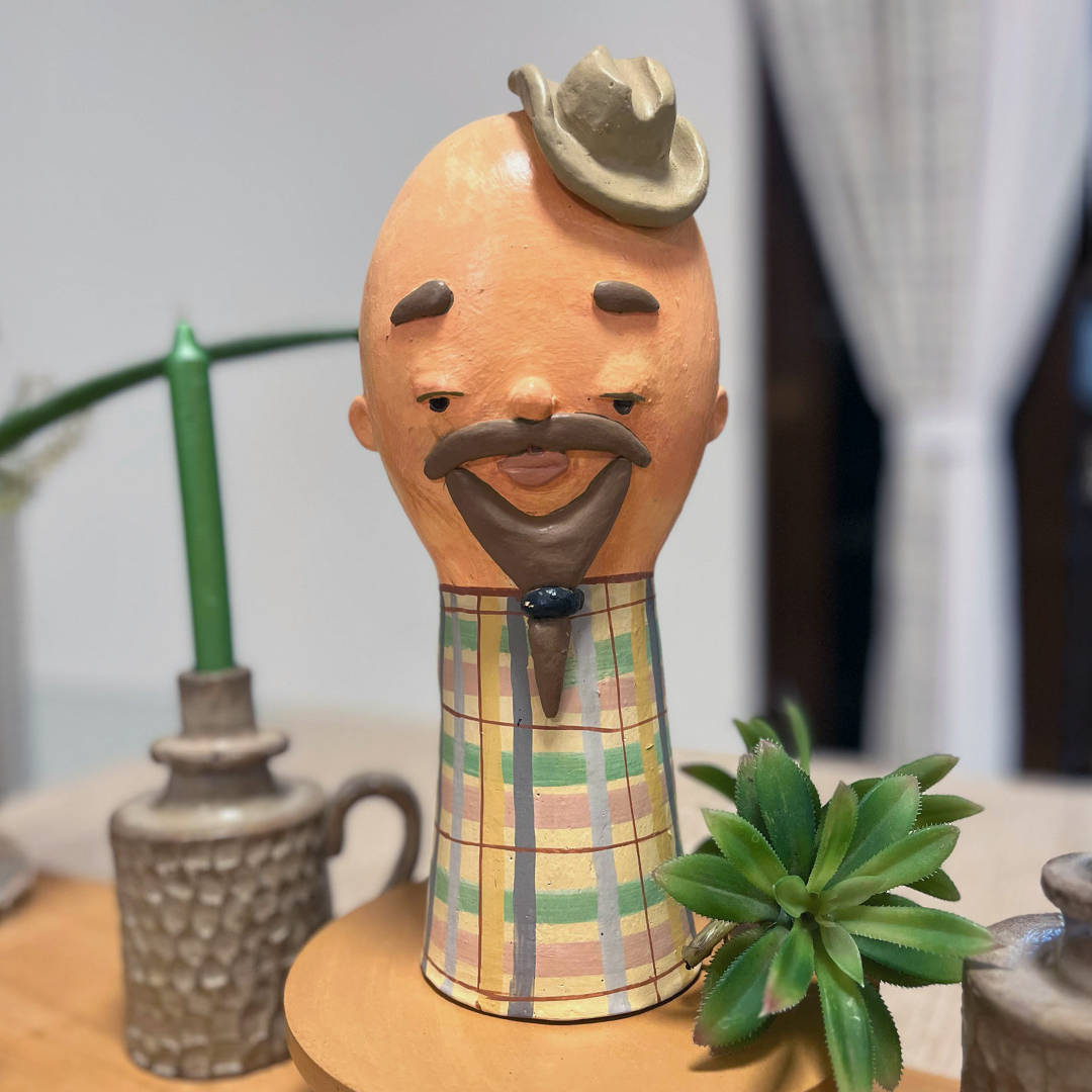 Escultura decorativa em cerâmica artesanal, com estilo lúdico.