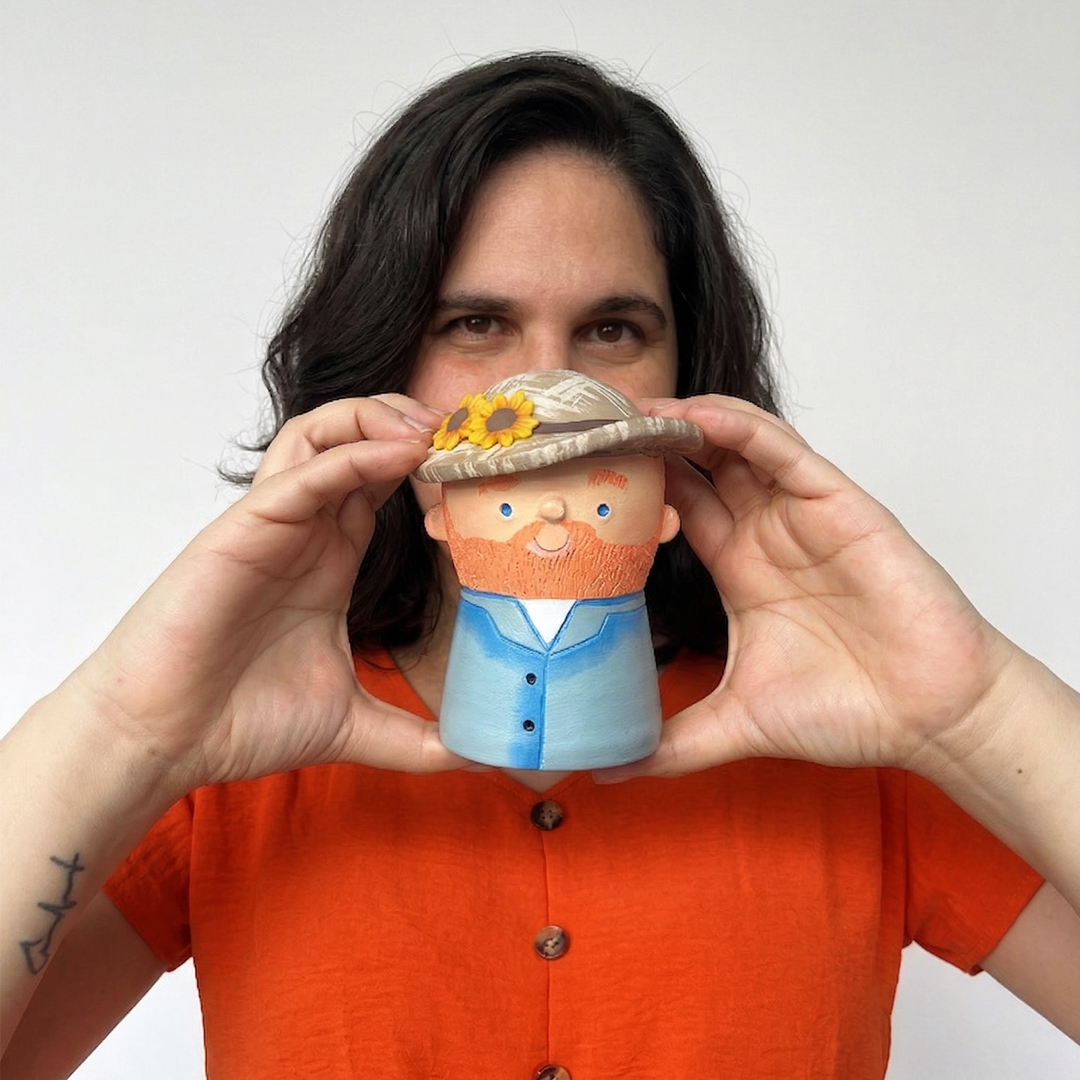 Essa miniatura em cerâmica traz uma releitura lúdica de Van Gogh, com traços suaves, cores acolhedoras e detalhes que encantam à primeira vista — do chapéu com girassóis à expressão serena.