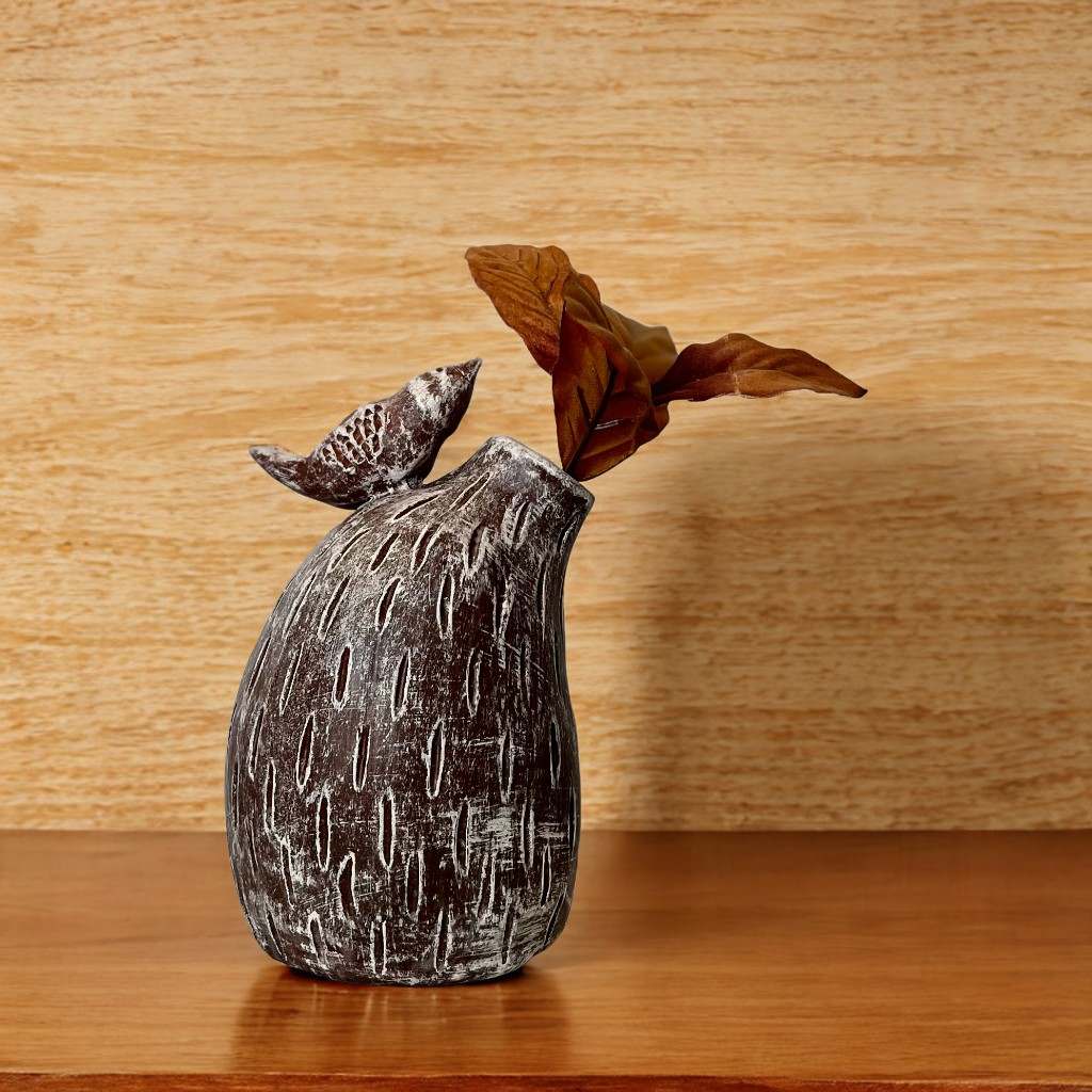 Escultura decorativa em cerâmica artesanal, com estilo rústico.